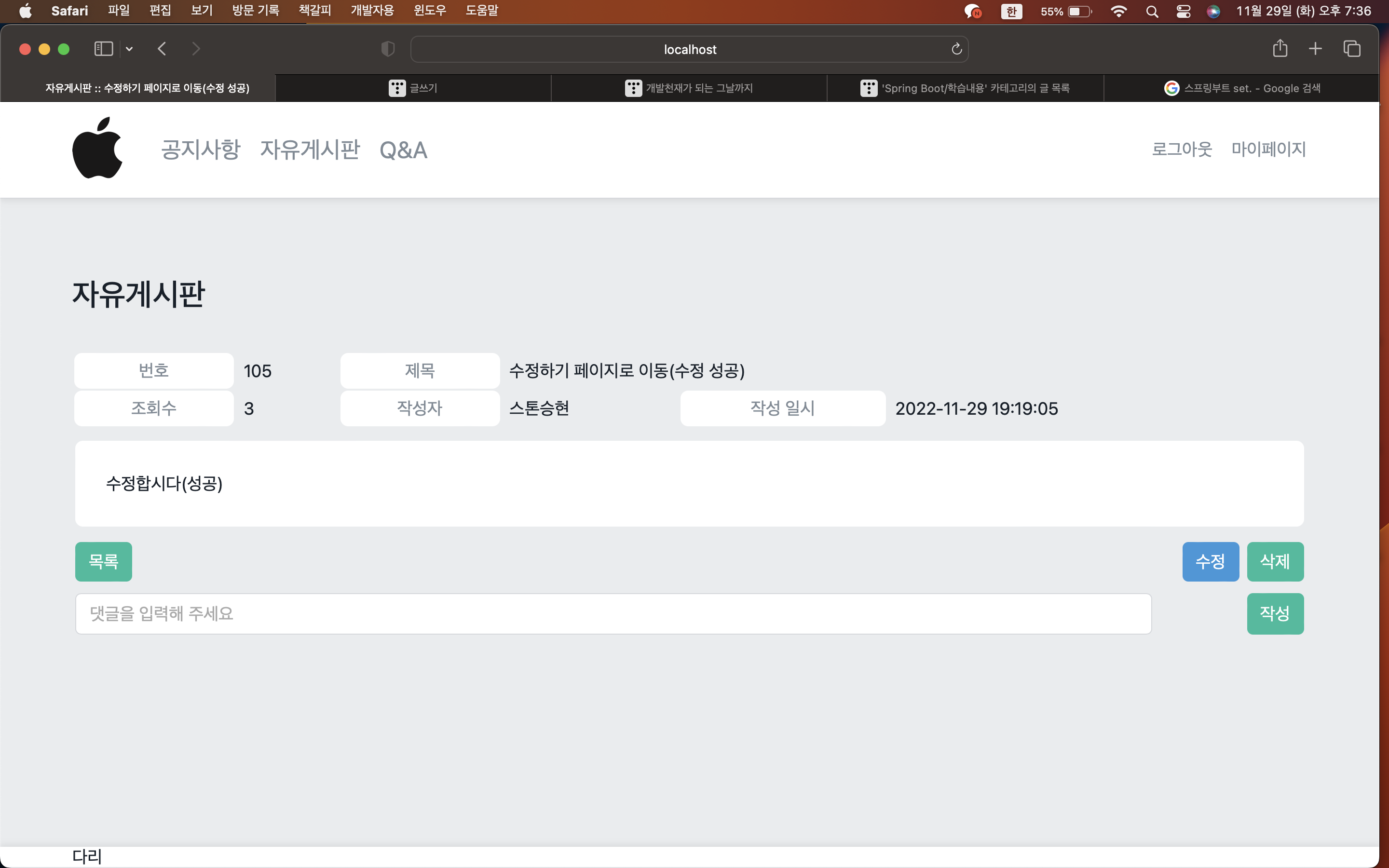 | [Spring Boot] 게시판 만들기7 (댓글 수정) (0) | 2022.11.26 |